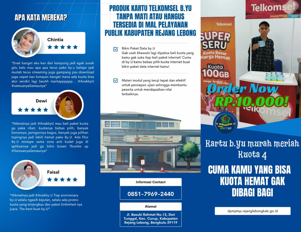 Produk kartu telkomsel b.yu tanpa mati atau hangus tersedia di mal pelayanan publik kabupaten rejang lebong 7 Februari 202413 Juni 2024 dpmptsp